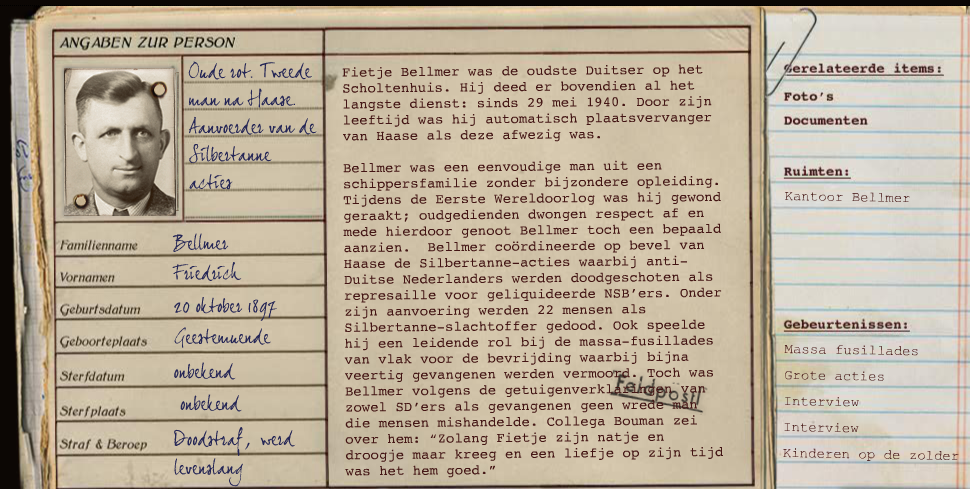 Fietje Bellmer was de oudste Duitser op het Scholtenhuis. Hij deed er bovendien al het langste dienst sinds 29 mei 1940. Door zijn leeftijd was hij automatisch plaatsvervanger van Haase als deze afwezig was.