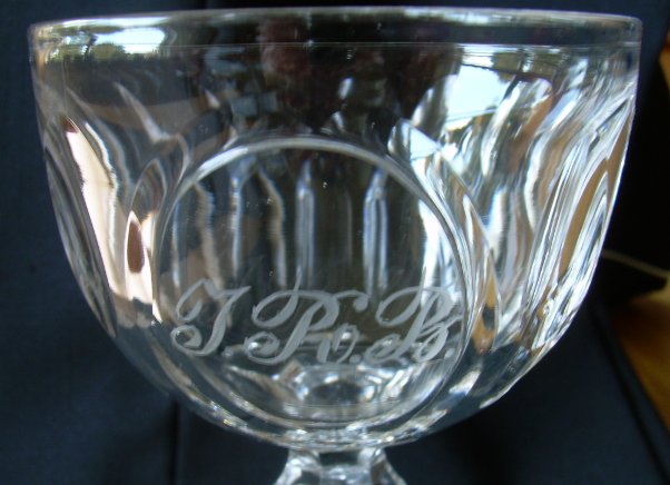 3. Een kristallen, geslepen wijnglas met de letters J.R.B. erin. (close up)