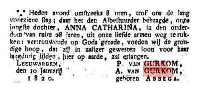 De vader van Aukje van Gurkom was, zoals gezegd, Willem Theodorus van Gurkom. Hij was geboren op 14 nov 1785 te Leeuwarden (doop 07 dec 1785 Leeuwarden religie: NH), als derde kind van Petrus van Gurkom en Aukje van Boerum.